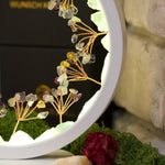 Im Zentrum steht der schillernde Regenbogen-Fluorit, eingefasst in feinen Kupferdraht und geformt zu zarten Lebensbäumen, die von klaren Kristallästen umgeben sind.