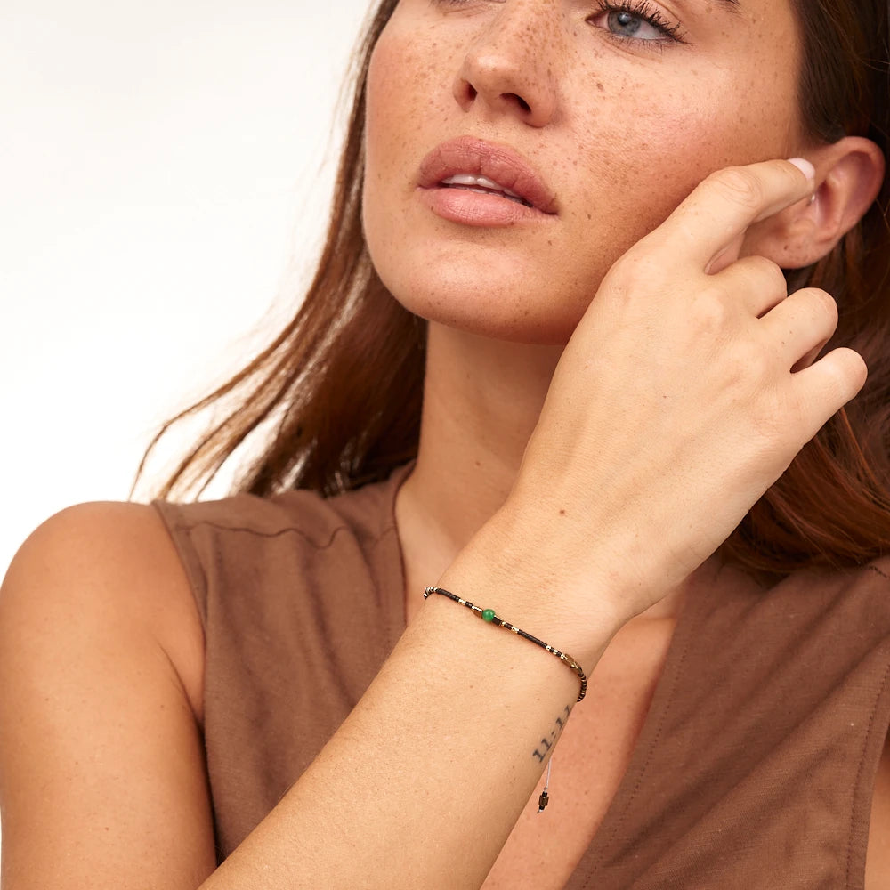 Modell trägt das Herzchakra Armband Deluxe am Handgelenk – Eleganter und spiritueller Schmuck für Energiefluss.