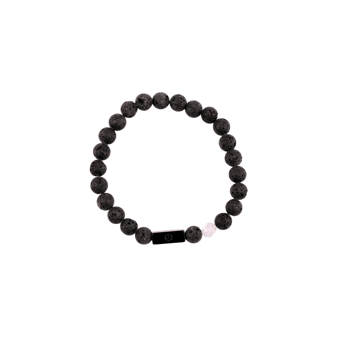 Lava Steine auf elastischem Band. Mit einem grossen Wunsch Kristall und Plättchen mit dezenter (nur für den Träger sichtbarer) Gravur: WISH - PLAN - DO