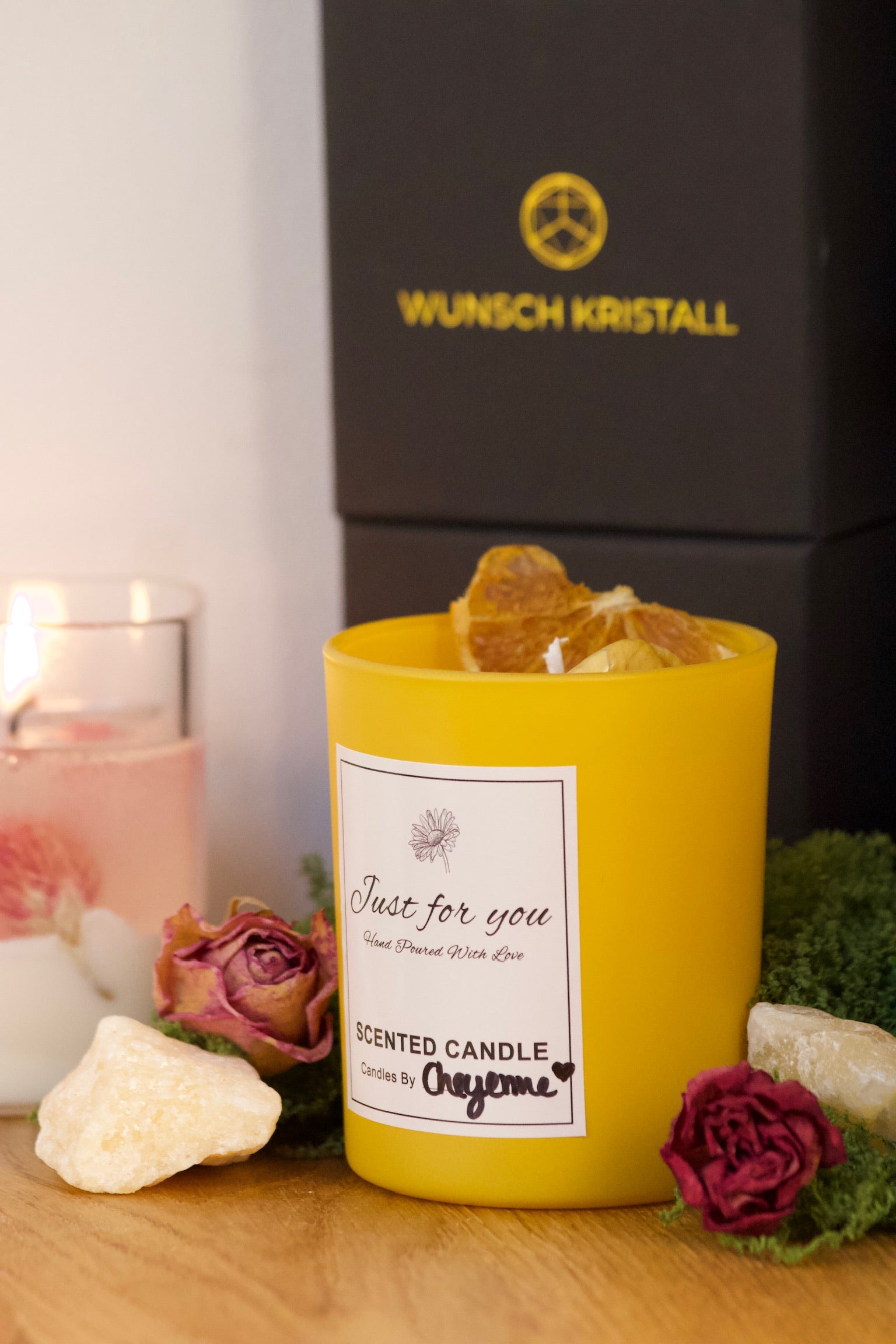 Jede Kerze ist ein Unikat – mit echten Kristallen, Naturblüten und reinem Sojawachs.