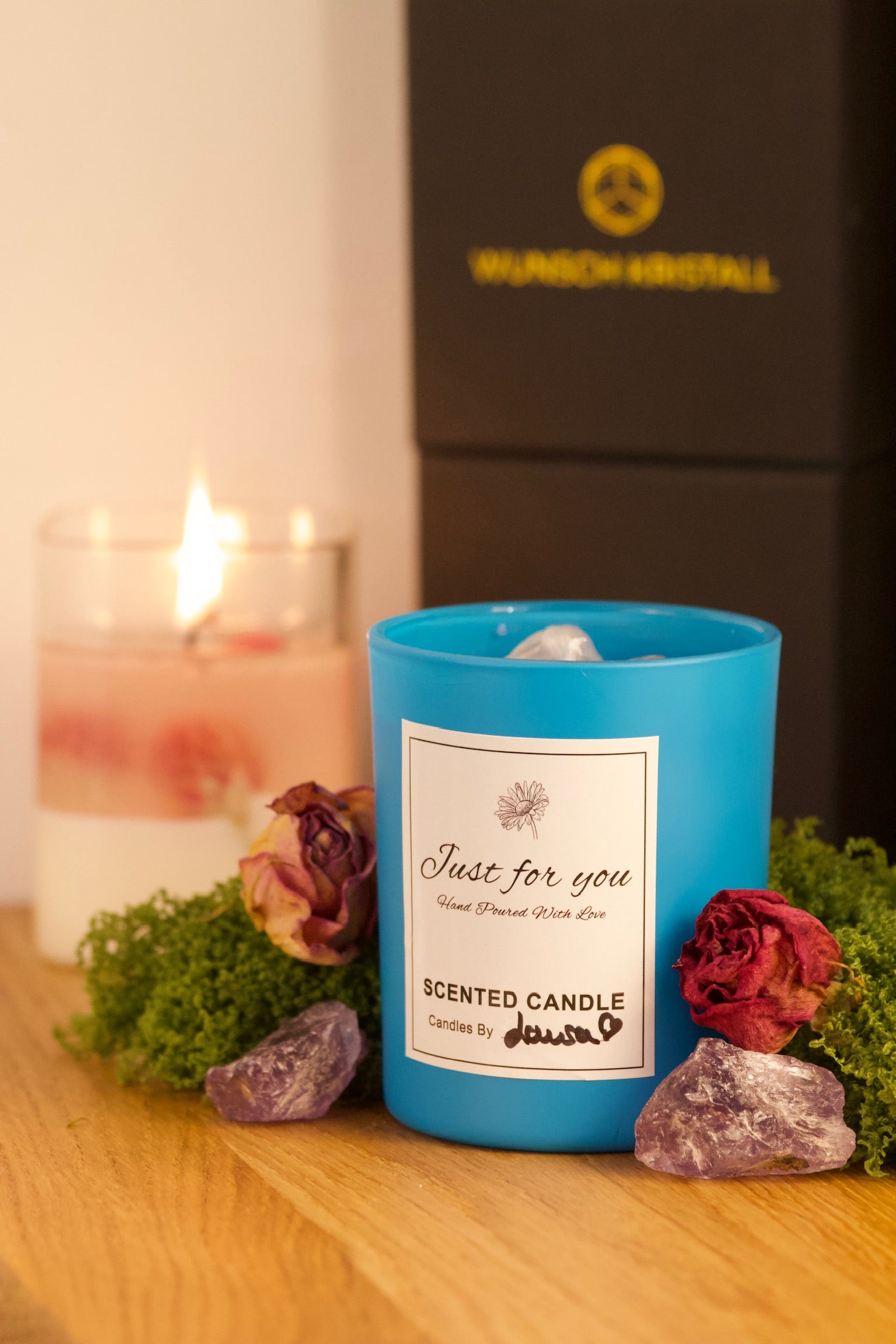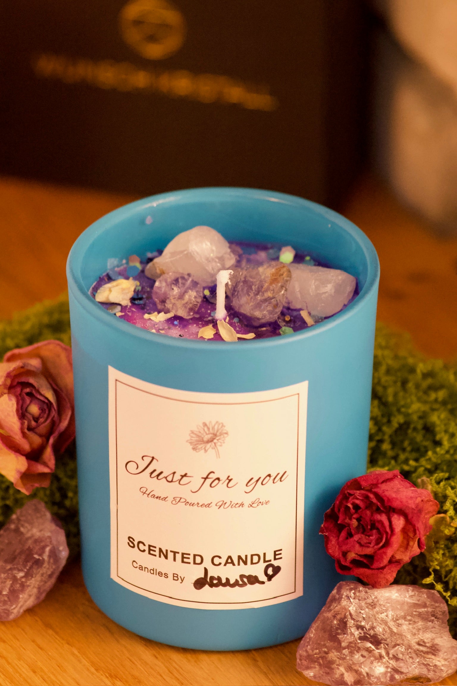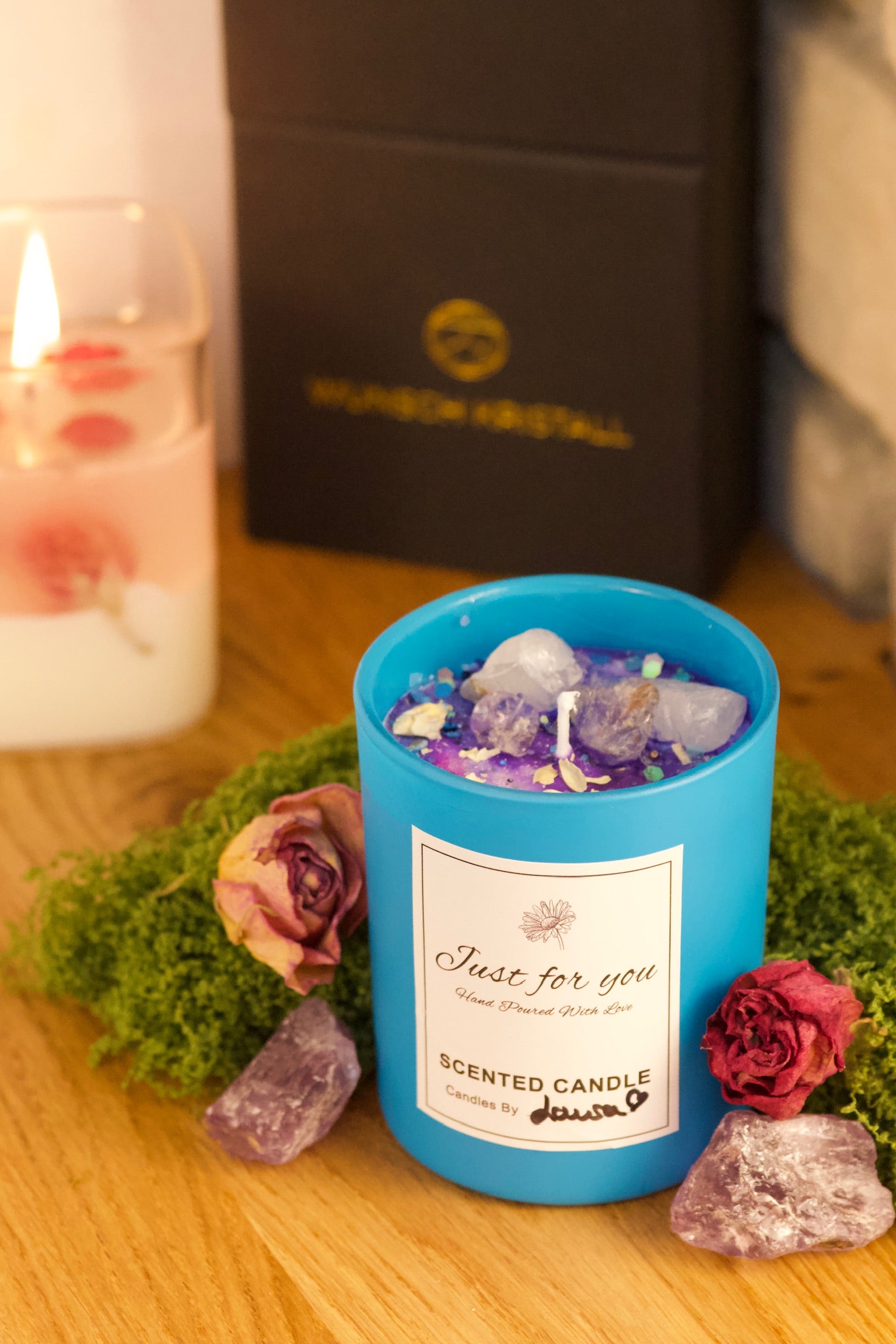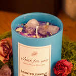 Jede Kerze ist ein Unikat – mit echten Kristallen, Naturblüten und reinem Sojawachs.