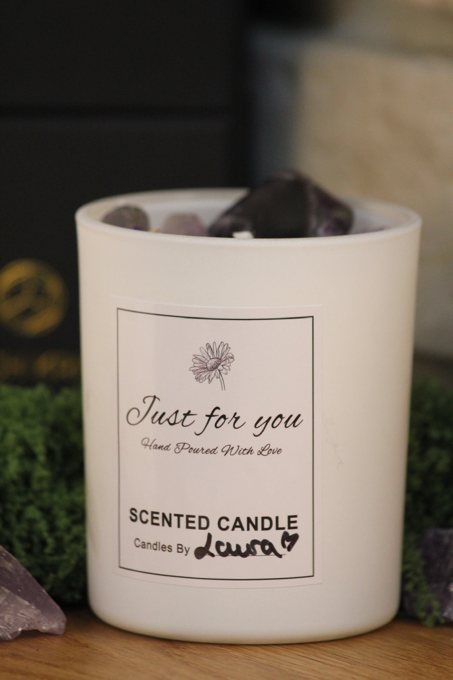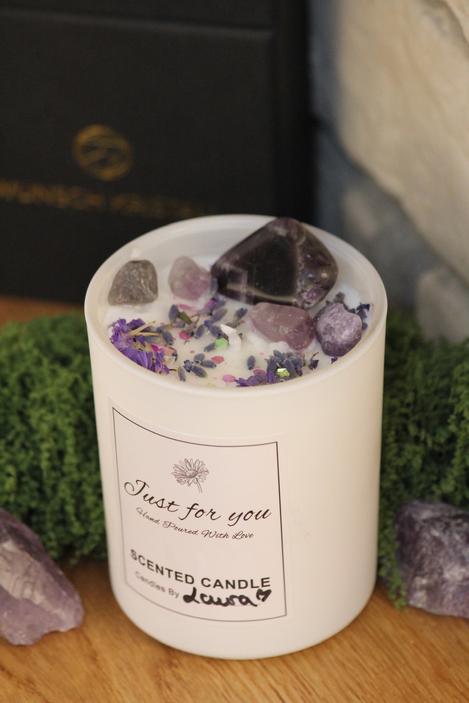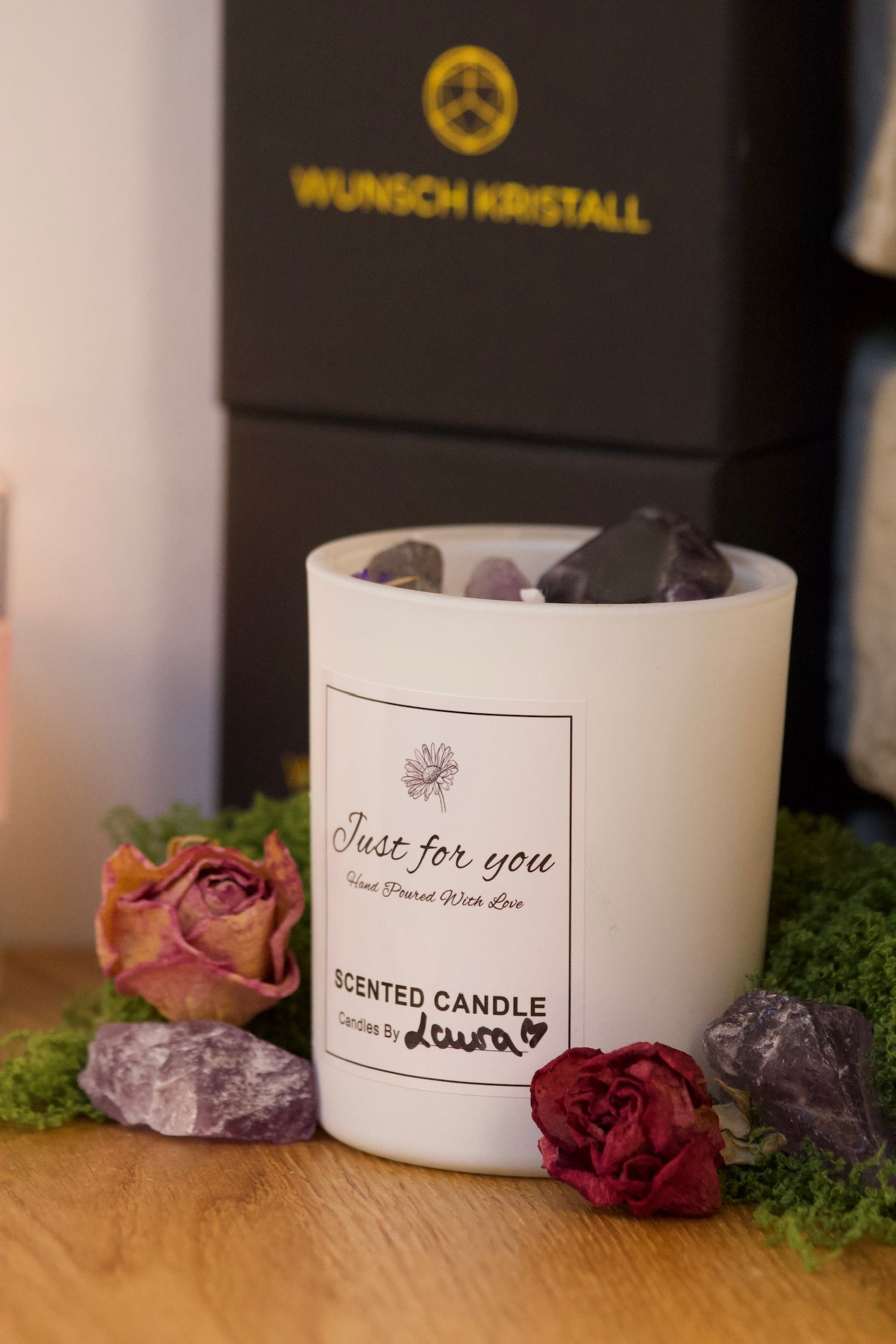 Jede Kerze ist ein Unikat – mit echten Kristallen, Naturblüten und reinem Sojawachs.