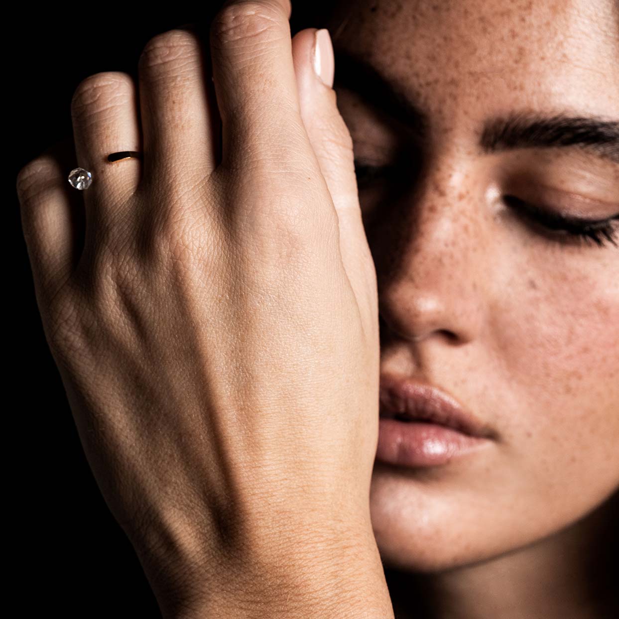 Wunsch Kristall RING – funkelnder Ring, elegant präsentiert auf der Hand vor dem Körper